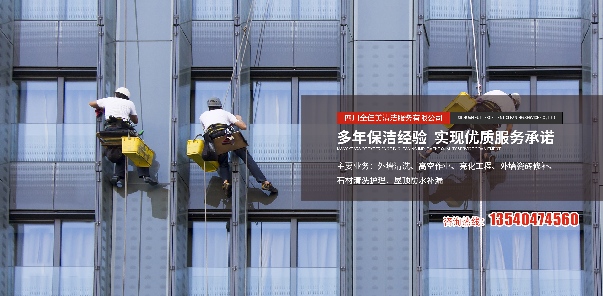 四川全佳美清潔服務(wù)有限公司成立于2017年11月20日,注冊資本200萬元人民幣,是一家專業(yè)從事高空外墻清洗,外墻維修,開荒保潔,石材養(yǎng)護,外墻防水等一體化的工程服務(wù)公司。公司先后服務(wù)于成都鐵路培訓學校,雙流空港酒店,省體育館等寫字樓及工業(yè)園區(qū)的外墻清洗保潔及維修服務(wù)。經(jīng)過多年的發(fā)展與努力,公司已具備一定的規(guī)模及實力。現(xiàn)擁有一支技術(shù)精湛的服務(wù)團隊,以高標準的服務(wù)品質(zhì),專業(yè)的安全技術(shù)實力,為全川不同群體的客戶提供更安全,更周到的清洗服務(wù)解決方案,期待與你的合作。